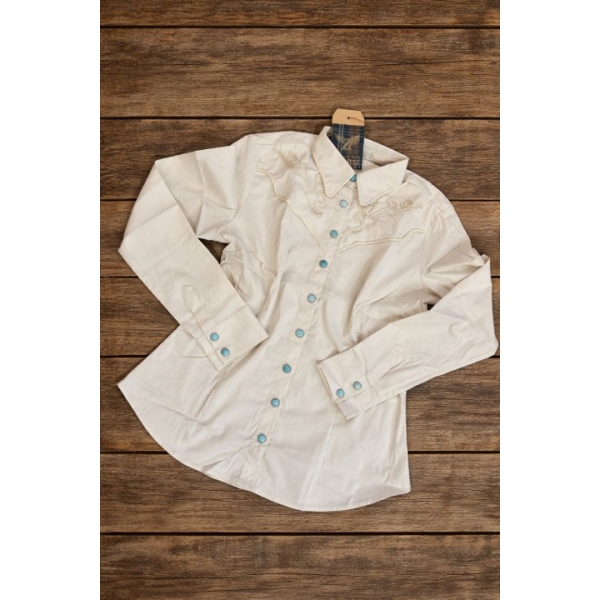 A Camisa Zenz Western Ranchwest traz o equilíbrio perfeito entre tradição country e modernidade. Com modelagem acinturada que valoriza a silhueta, é confeccionada em tecido off white confortável e levemente flexível. Possui recorte de pala frontal e traseira com acabamento em vivo na mesma cor, além de bordados em cordão off white que reforçam a identidade western da peça. O fechamento da vista e dos punhos é feito por botões de pressão em azul turquesa, proporcionando contraste elegante e praticidade no uso.