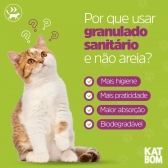 O granulado KatBom absorve a urina instantaneamente, formando os torrões antes que esses odores se desenvolvam, com menor quantidade de produto. O granulado Katbom é atóxico, biodegradável, e 100% natural, sendo também a melhor opção na preservação da qualidade ambiental.