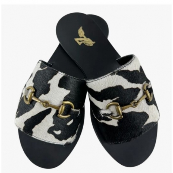Rasteirinha Couro Legítimo Zenz Western Pelo Vaca Preto E Branco Com Bridão
