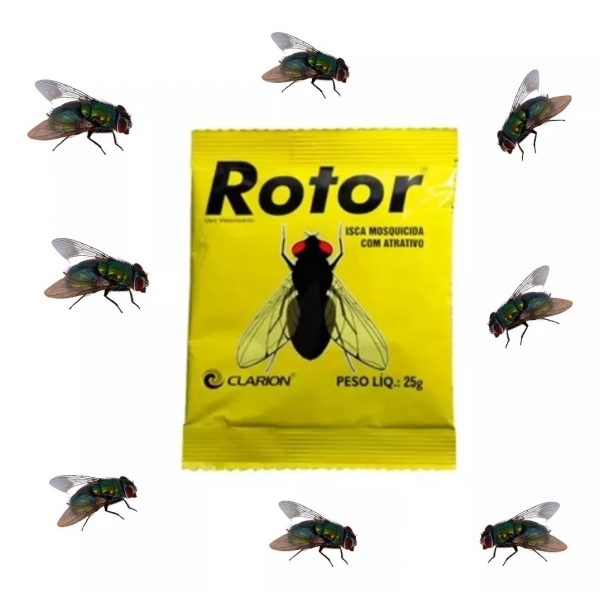 Rotor® é uma isca mosquicida ideal para o controle de moscas em ambientes infestados, tais como: granjas de aves e suínos, haras, abatedouros, currais, estábulos, laticínios, etc.