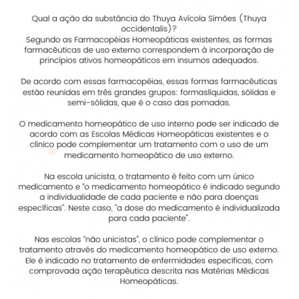Thuya Avícola Simões é um produto indicado no tratamento de bouba (pipoca), verrugas e epitelioma contagioso das aves em geral (galinha, peru, pato, pássaros de gaiola e viveiro) em todas as fases da criação, evitando as complicações que a doença produz, podendo ser aplicado diretamente ou diluído no bebedouro.